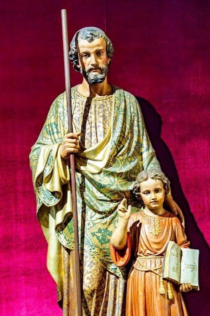 St. Joseph’s role as protector and provider is paramount within the devotion highlighted in the ‘St Joseph Holy Cloak Novena PDF’. He diligently safeguarded Jesus and Mary, demonstrating unwavering commitment to their wellbeing – a model for all believers seeking divine assistance. The novena emphasizes petitioning St. Joseph for similar protection in our own lives, facing modern challenges with faith.